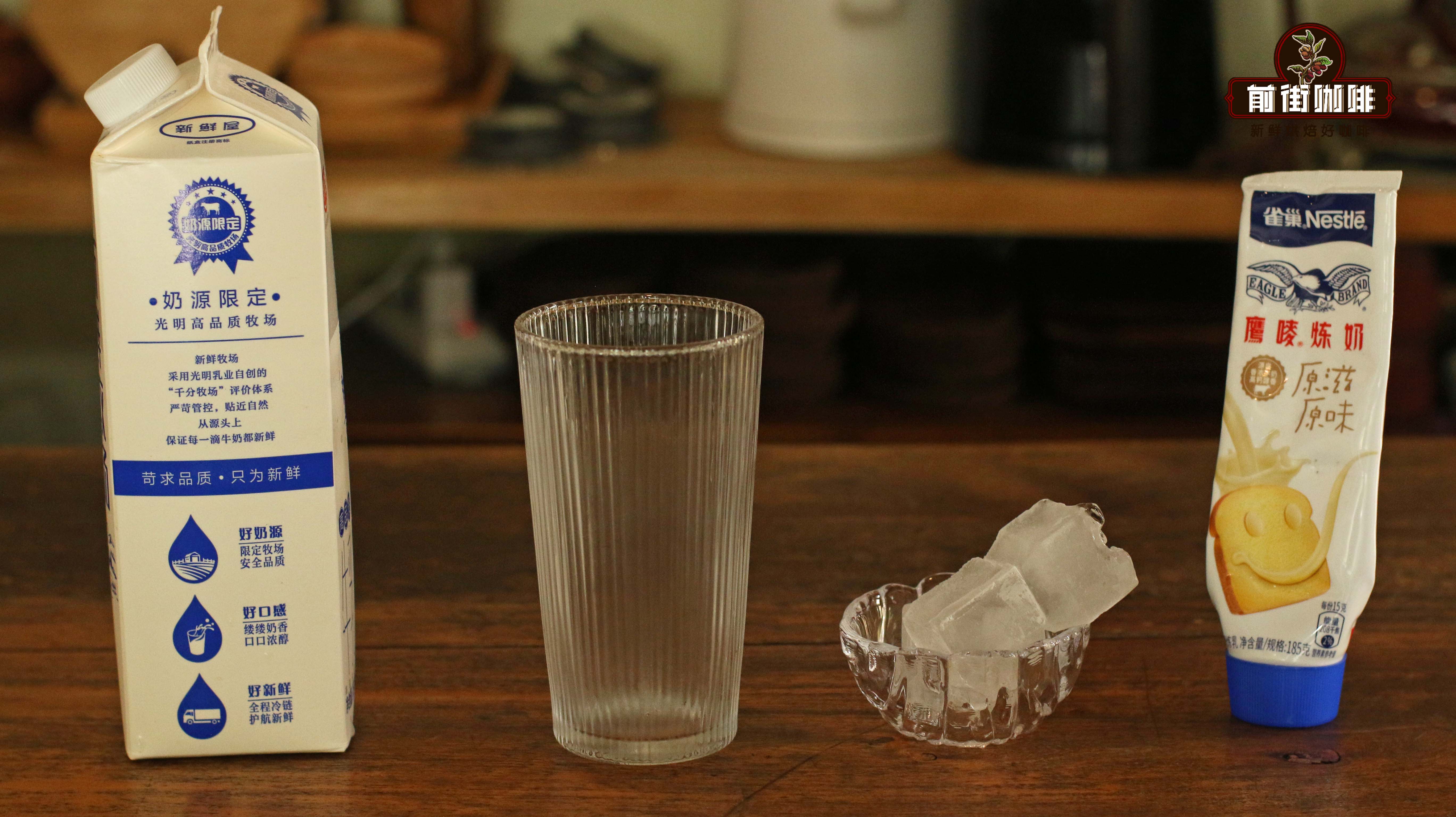 先准备一个300ml的杯子,一支炼奶,一份牛奶,一些冰块。