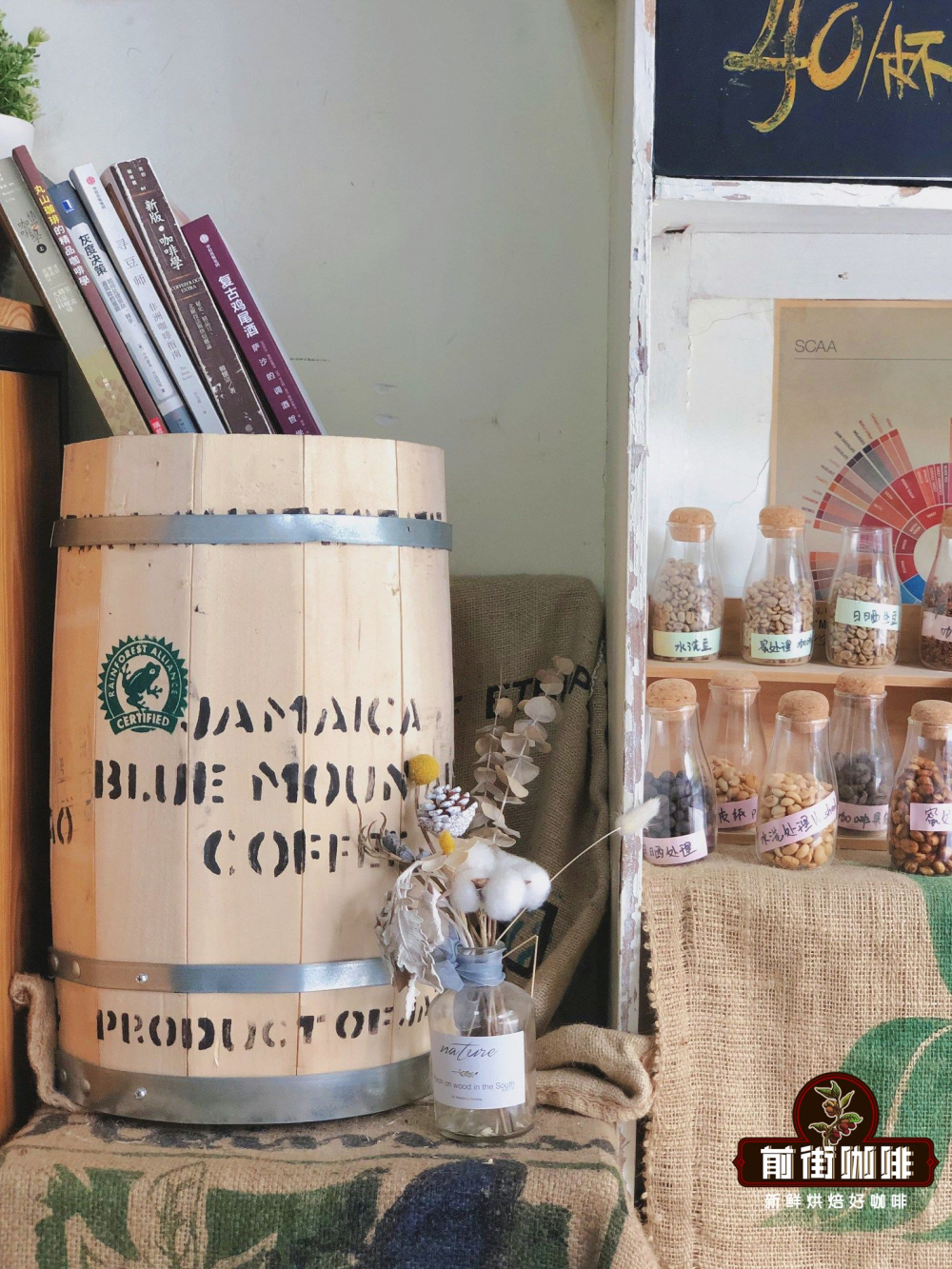 与世界各地常见的麻袋装咖啡生豆不同,牙买加如今是唯一使用木桶装载咖啡生豆的产区。前街咖啡的门店悬挂着牙买加蓝山咖啡豆认证证书,豆架旁摆放着装载蓝山咖啡豆生豆的木桶。